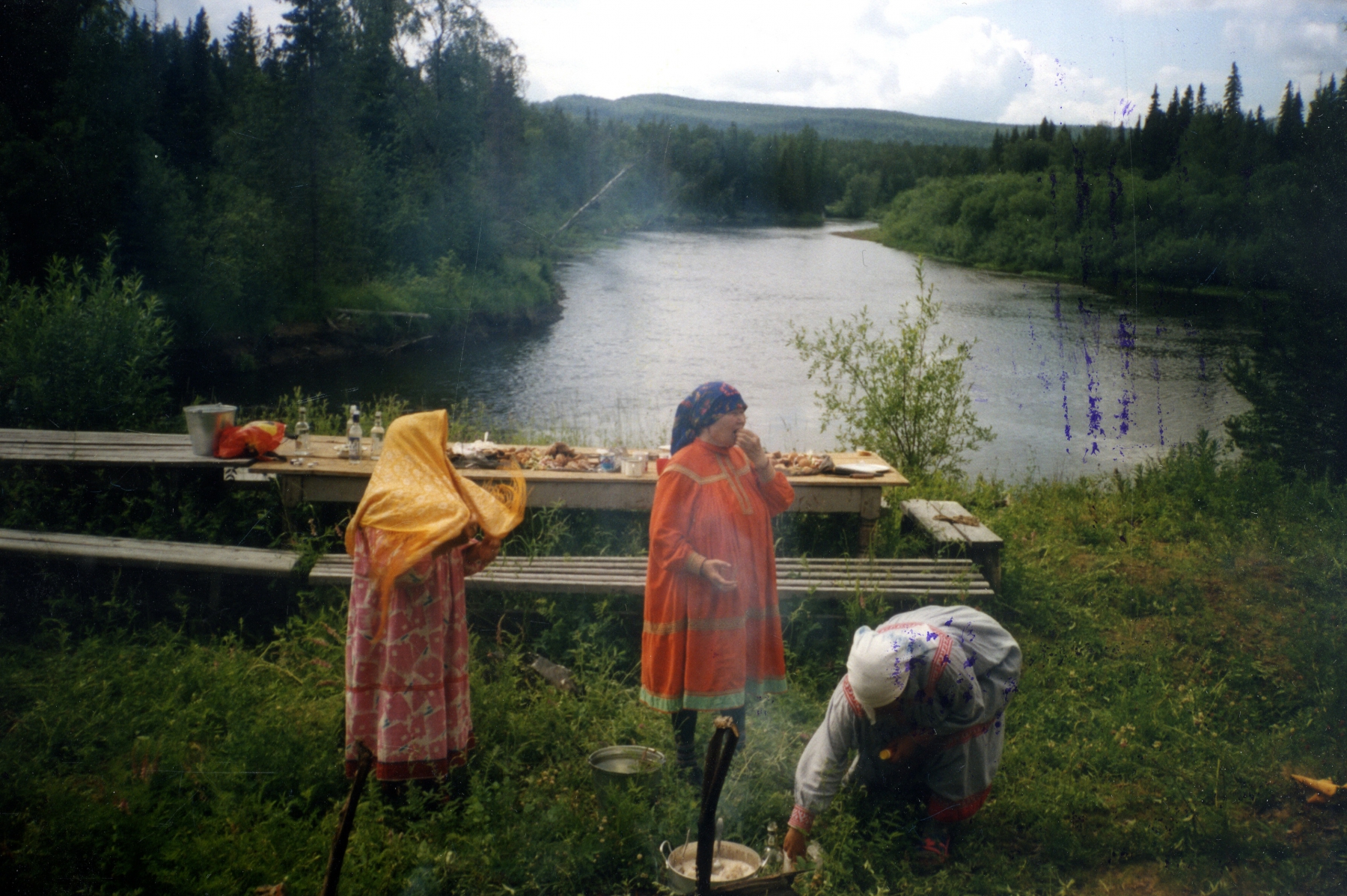 Анямова А.В. (слева в платке) на священном месте на берегу реки Лозьвы приглашает участников ритуала к трапезе.